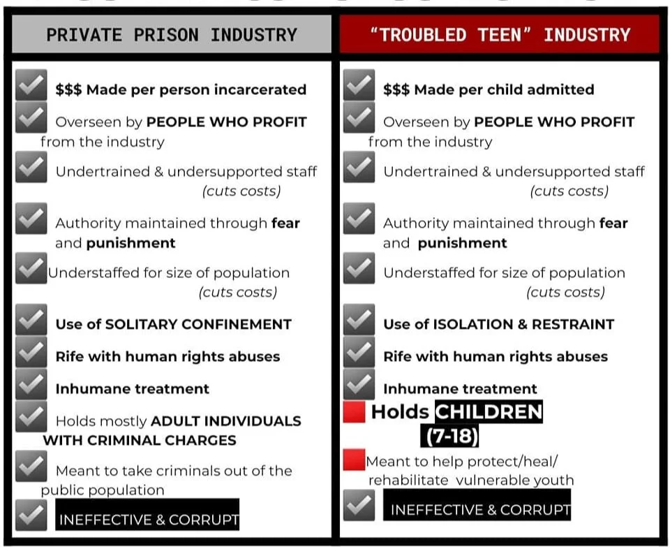 One of the simplest ways to clarify the systemic issues within the “Troubled Teen” Industry is to show its parallels to the private prison industry.